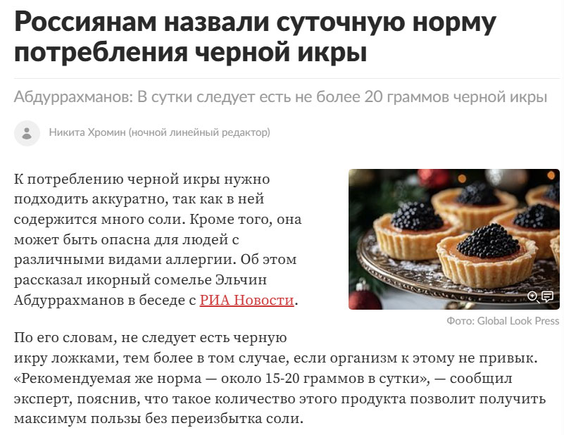 К потреблению чёрной икры, пишет «Лента.ру» со ссылкой на «икорного сомелье» Эльчина Абдуррахманова, нужно подходить аккуратно. По его словам, не следует есть чёрную икру ложками, тем более в том случае, если организм к этому не привык. «Рекомендуемая же норма — около 15–20 граммов в сутки», — сообщил эксперт.